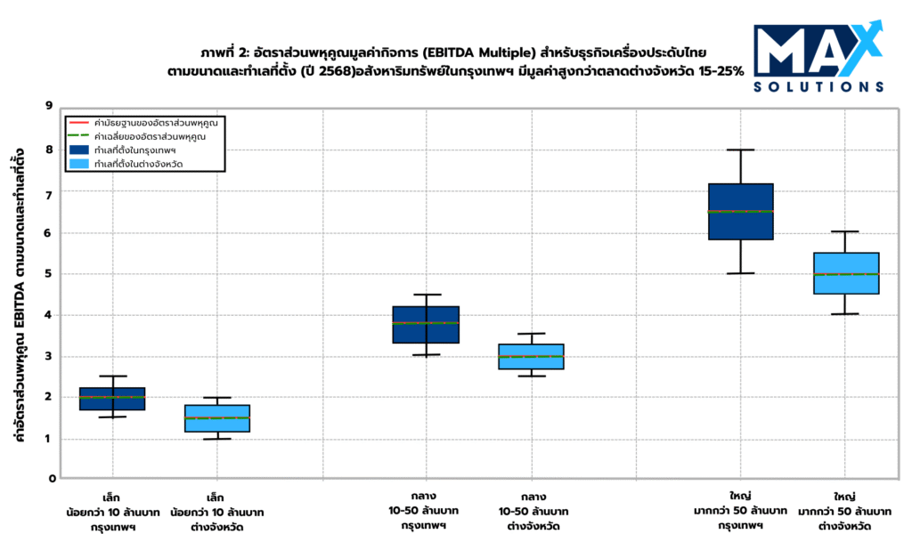 ตอบ: ตัวคูณการประเมินมูลค่าขึ้นอยู่กับขนาด ทำเล และคุณภาพการดำเนินงาน ธุรกิจขนาดเล็ก (รายได้ < 10 ล้านบาท) มักได้ 1.5–2.5× EBITDA ในกรุงเทพฯ ขณะที่ผู้ส่งออกระดับพรีเมียม (รายได้ > 50 ล้านบาท) ที่มีการคุ้มครอง IP อย่างเป็นทางการและสถานะ BOI จะได้ 7.5–10.0× ขึ้นไป ทรัพย์สินในกรุงเทพฯ มักได้พรีเมียม 15–25% เหนือทำเลต่างจังหวัด เนื่องจากตลาดแข็งแรงกว่าและมีความสนใจจากผู้ซื้อมากกว่า ปัจจัยขับเคลื่อนมูลค่าหลัก ได้แก่ รายได้ประจำอย่างต่อเนื่อง ทรัพย์สินทางปัญญาที่ได้รับการคุ้มครอง การกระจายความเสี่ยงด้านการส่งออก และความเป็นอิสระจากการพึ่งพาเจ้าของ