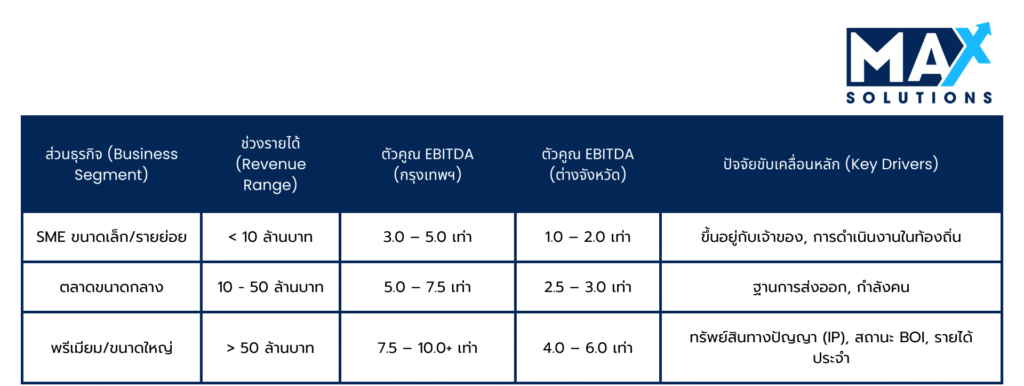โดยอ้างอิงข้อมูลตลาดเชิงปริมาณและเกณฑ์อ้างอิงของธุรกรรมในภูมิภาค เรากำหนดตัวคูณประเมินมูลค่าที่แม่นยำ ตั้งแต่ 3.0–5.0 เท่าของ EBITDA สำหรับกิจการขนาดเล็ก ไปจนถึง 7.5–10.0 เท่าขึ้นไปสำหรับผู้ส่งออกระดับพรีเมียม โดยทรัพย์สินในกรุงเทพฯ ได้รับพรีเมียมด้านทำเล 15–25%