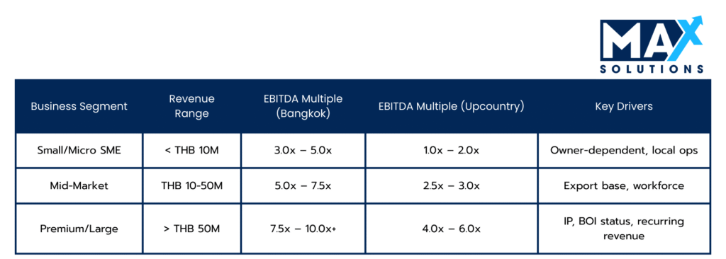 A: Valuation multiples depend on size, location, and operational quality. Small businesses (<THB 10M revenue) typically achieve 1.5-2.5x EBITDA in Bangkok, while premium exporters (>THB 50M) with formalized IP and BOI status command 7.5-10.0x+. Bangkok properties consistently achieve 15-25% premiums over provincial locations due to stronger markets and buyer interest. Key value drivers include recurring revenue streams, protected intellectual property, export diversification, and independence from owner operations.
