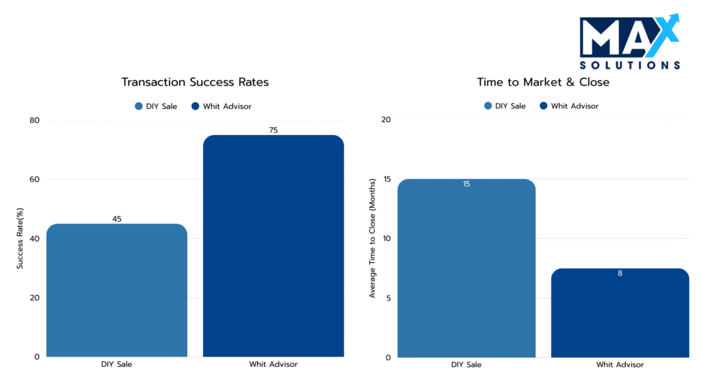 • Faster completions: Professional processes reduce time-to-close by approximately 25%, with the average advisor-led transaction completing in 8-9 months versus 12+ months for owner-led sales