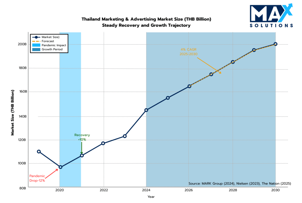 Thailand’s marketing industry presents a complex yet rewarding exit landscape for SME owners, with the THB 140-150 billion market demonstrating resilient 4.02% CAGR growth through 2033 despite immediate headwinds (IMARC Group, 2024). Our quantitative analysis reveals that properly orchestrated marketing business sales achieve