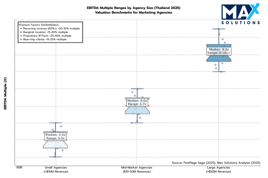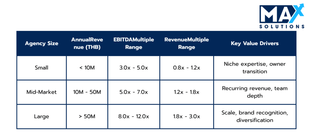 Multiples depend primarily on size and operational characteristics: Small agencies (<THB 10M revenue) typically achieve 3-5x EBITDA, mid-market firms (THB 10-50M) command 5-7x, while large agencies (>THB 50M) achieve 8-10x+. Premium factors like recurring revenue >60%, proprietary IP, and blue-chip clients can add 20-40% to baseline multiples.
