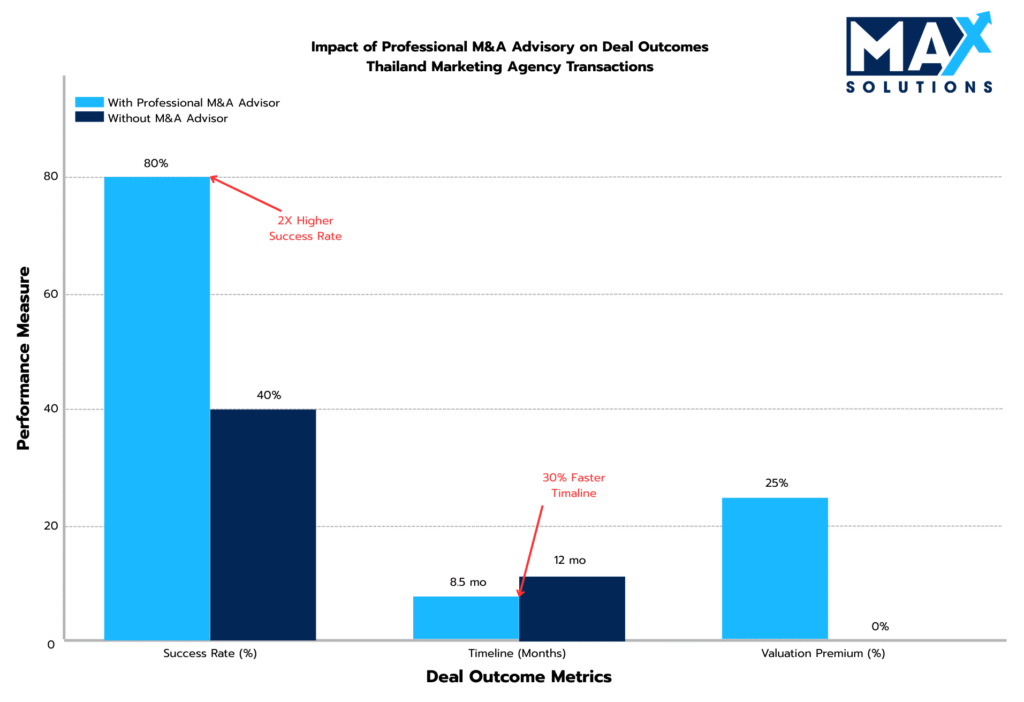 For marketing business owners contemplating a sale, the quantitative evidence is clear: professional M&A advisory consistently delivers superior outcomes. Research demonstrates valuation premiums of 20–30%, completion rates nearly double those of owner-led processes, and shorter transaction timelines that preserve momentum and value. With transaction values often reaching hundreds of millions of baht, the incremental proceeds generated through expert representation far outweigh advisory fees, yielding substantial ROI for sellers.