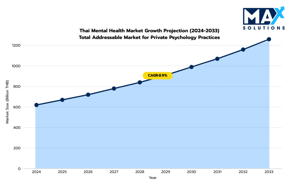 Thailand’s mental health services market presents an exceptional opportunity for Psychiatric Therapy Practice owners contemplating an exit in 2025. The sector is experiencing robust growth, with the market projected to expand from THB 580 billion in 2024 to THB 1.25 trillion by 2033-a compelling 8.9% compound annual growth rate (IMARC Group, 2025). This growth trajectory, driven by escalating public awareness (40% of Thais cite stress as their primary health concern) and severe practitioner shortages (only 0.26 psychologists per 100,000 population), creates a favorable M&A environment where established practices command premium valuations.