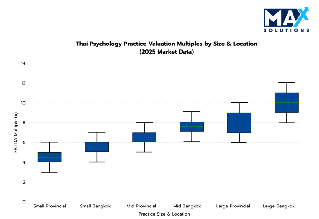Our quantitative analysis reveals that Thai Psychiatric Therapy practices typically trade at 4-10x EBITDA multiples depending on size, location, and operational characteristics, with Bangkok practices commanding approximately 20% valuation premiums (JLL, 2025). Mid-sized practices (THB 10-50M annual revenue) in Bangkok typically achieve 6-8x EBITDA multiples, while larger operations can reach 8-10x multiples.