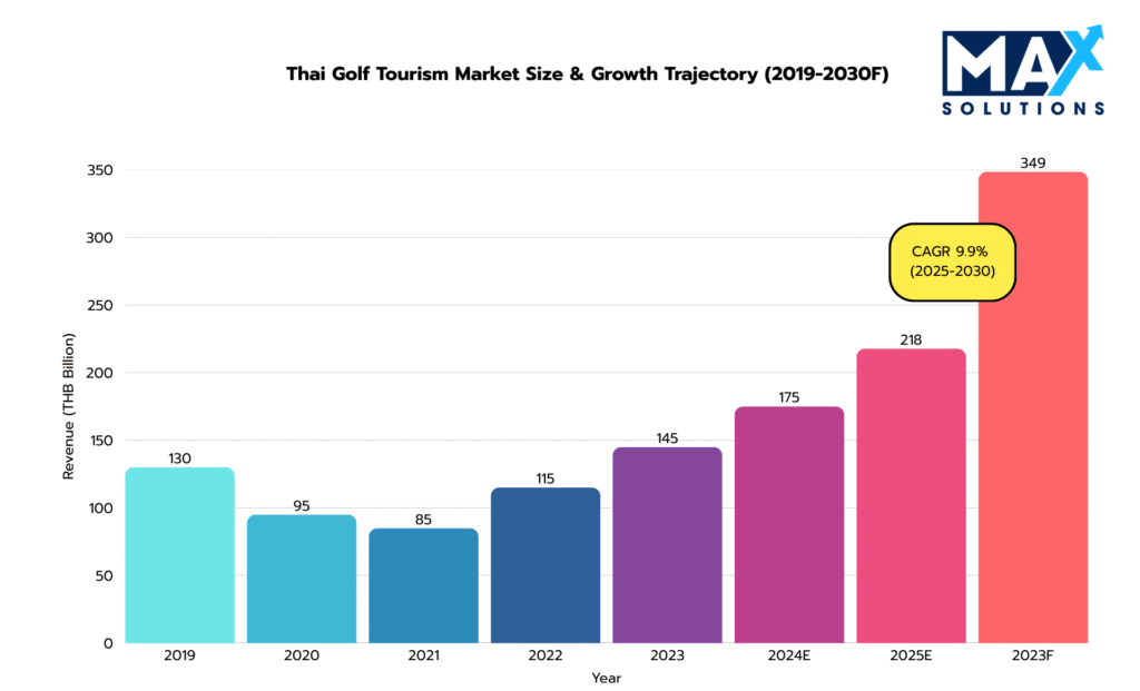 Thailand’s golf industry stands as one of the region’s most lucrative leisure segments, generating THB 217.7 billion in 2025 with forecasts reaching THB 348.6 billion by 2030 (9.9% CAGR). Fueled by 700,000+ annual golf tourists, robust domestic participation, and growing foreign investor interest, the sector presents exceptional exit opportunities for course owners. Premium golf properties in Bangkok, Phuket, and Chiang Mai routinely trade at 10–13× EBITDA, reflecting both tourism resilience and strategic asset scarcity (Grand View Research, 2025).