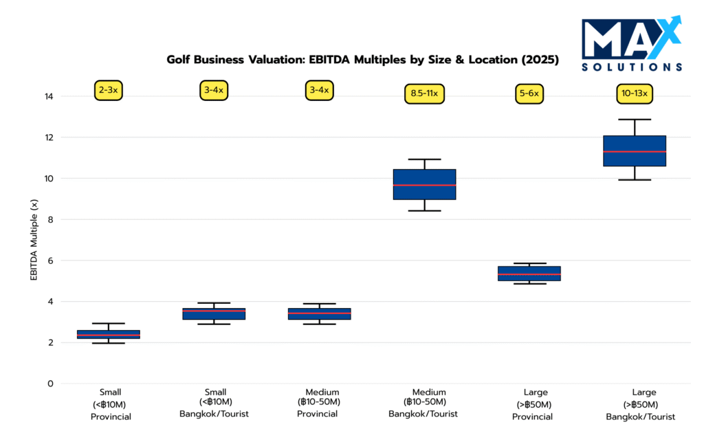 A) Thai golf courses trade at 2-13× EBITDA depending on size and location. Small provincial courses achieve 2-3× EBITDA, while premium Bangkok properties command 10-13× EBITDA. Revenue multiples range from 0.3-0.5× to 1.0-1.2×. Location premiums add 10-30%.