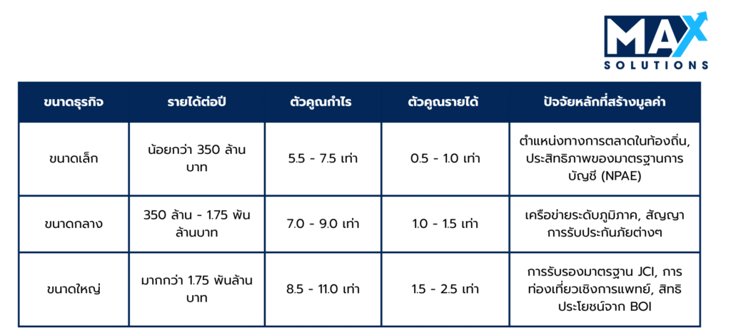 - ค่า Multiple การประเมินมูลค่าอยู่ในช่วง 5.5–11.0 เท่าของ EBITDA ขึ้นอยู่กับขนาด ทำเลที่ตั้ง และสถานะการรับรองมาตรฐาน