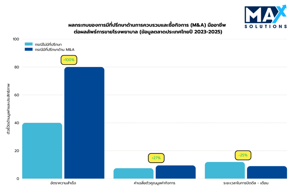 - Advisor selection: ว่าจ้างที่ปรึกษา M&A ที่มีความเชี่ยวชาญด้านธุรกิจโรงพยาบาล ข้อมูลชี้ให้เห็นว่าที่ปรึกษามืออาชีพสามารถช่วยให้มูลค่าธุรกิจเพิ่มขึ้น 10–30% และเพิ่มโอกาสความสำเร็จของดีลได้เป็นสองเท่า