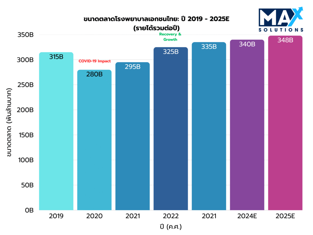 Krungsri Research (2024) รายงานว่า ภาคส่วนนี้มีการเติบโตที่แข็งแกร่งก่อนโควิดที่อัตรา 7–10% ต่อปี จากนั้นหดตัวลง 10–12% ในปี 2020 และนับแต่นั้นได้ฟื้นตัวขึ้นมา โดยคาดการณ์การเติบโตในระดับปานกลาง 3–5% ต่อปีไปจนถึงปี 2025 สำหรับเจ้าของโรงพยาบาลที่กำลังพิจารณากลยุทธ์การออกจากธุรกิจ การที่ตลาดเข้าสู่ภาวะทรงตัวในปัจจุบันถือเป็นช่วงเวลาที่เหมาะสม เนื่องจากหลังการฟื้นตัว มูลค่ากิจการได้กลับเข้าสู่ภาวะปกติ ขณะที่ความต้องการซื้อจากเครือโรงพยาบาลในประเทศ ผู้ประกอบการระหว่างประเทศ และกองทุนไพรเวตอิควิตี ยังคงอยู่ในระดับสูง