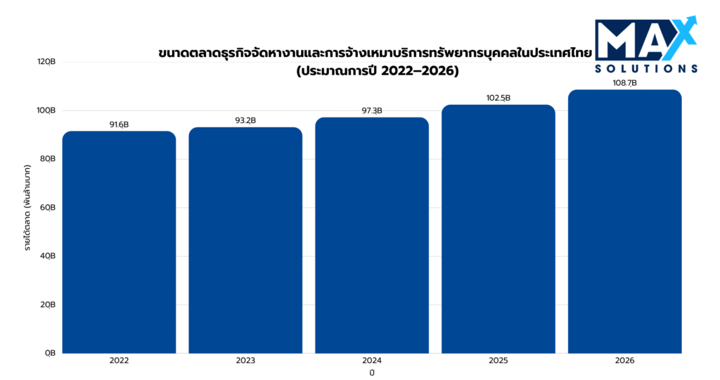 Thailand’s recruitment and HR outsourcing market has demonstrated resilient post-pandemic growth, expanding from ฿91.6 billion (2022) to ฿97.27 billion (2024), with contract staffing segments achieving 19-22.8% annual growth rates—the highest in Asia Pacific (Staffing Industry Report, 2024). This expansion reflects fundamental labor market dynamics: unemployment below 1%, accelerating wage inflation (8-12% in technology sectors), and structural talent shortages driven by Thailand’s rapidly aging demographic profile.
