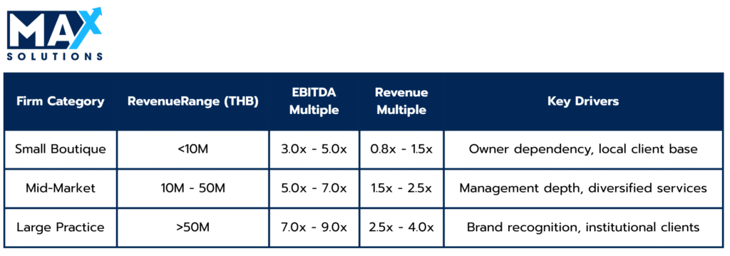 Thai consulting business valuations reflect sophisticated methodologies adapted to local market conditions and regulatory constraints. Our comprehensive analysis establishes precise benchmarks across firm sizes and operational characteristics such as in the chart below showcasing EBITDA Multiples by size and location.