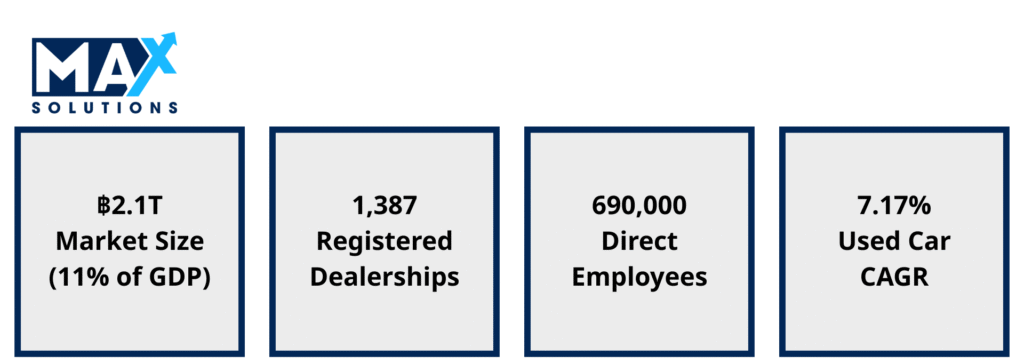 Thailand’s automotive industry represents a ฿2.1 trillion cornerstone of the national economy, employing 690,000 people directly and accounting for 11% of GDP (Finansia Syrus, 2025). Despite recent market contractions—with 2024 production declining 20.2% to 1.47 million units—strategic opportunities abound for well-positioned business sales. The used car segment demonstrates remarkable resilience with projected 7.17% CAGR growth through 2030, creating compelling value chains for strategic buyers (Mordor Intelligence, 2025). This report provides a quantitative framework for automotive business owners contemplating exit strategies, emphasizing the critical importance of professional M&A advisory to navigate Thailand’s complex regulatory landscape and maximize transaction value.