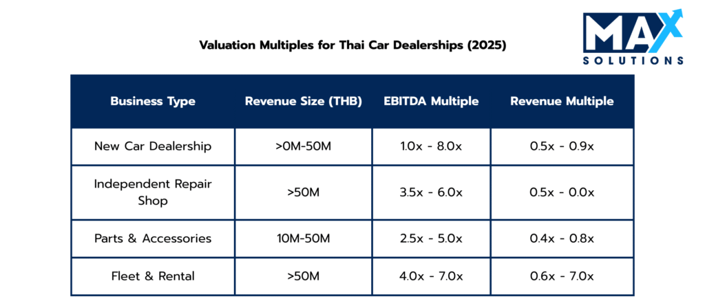 “Renazzo Motors Co.” – A Dealership in major provincial city with an annual revenue: ฿45 million and normalized EBITDA: ฿5 million sitting on a base valuation: 4.5× EBITDA = ฿22.5 million with franchise premium of +0.5× EBITDA = +฿2.5 million closed a final transaction of ฿24 million (4.8× EBITDA, 0.53× revenue) This case demonstrates how brand premiums and strategic positioning directly translate to enhanced valuations
