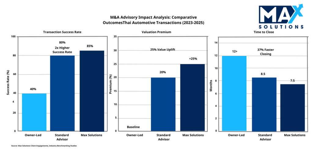 • Superior valuations: Automotive Businesses sold through advisors achieve 10-30% higher valuations (average 20% premium), directly translating to millions of THB in additional proceeds for owners